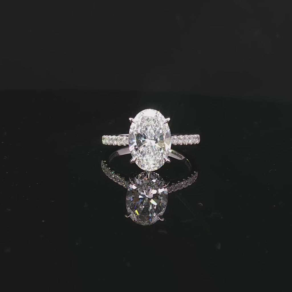 Meticulously crafted in luxurious platinum, this striking engagement ring pairs contemporary elegance with timeless design. The centrepiece is a captivating oval-cut lab-grown diamond weighing 3.27 carats, held in a refined claw setting that enhances its brilliance and beautifully elongated shape.